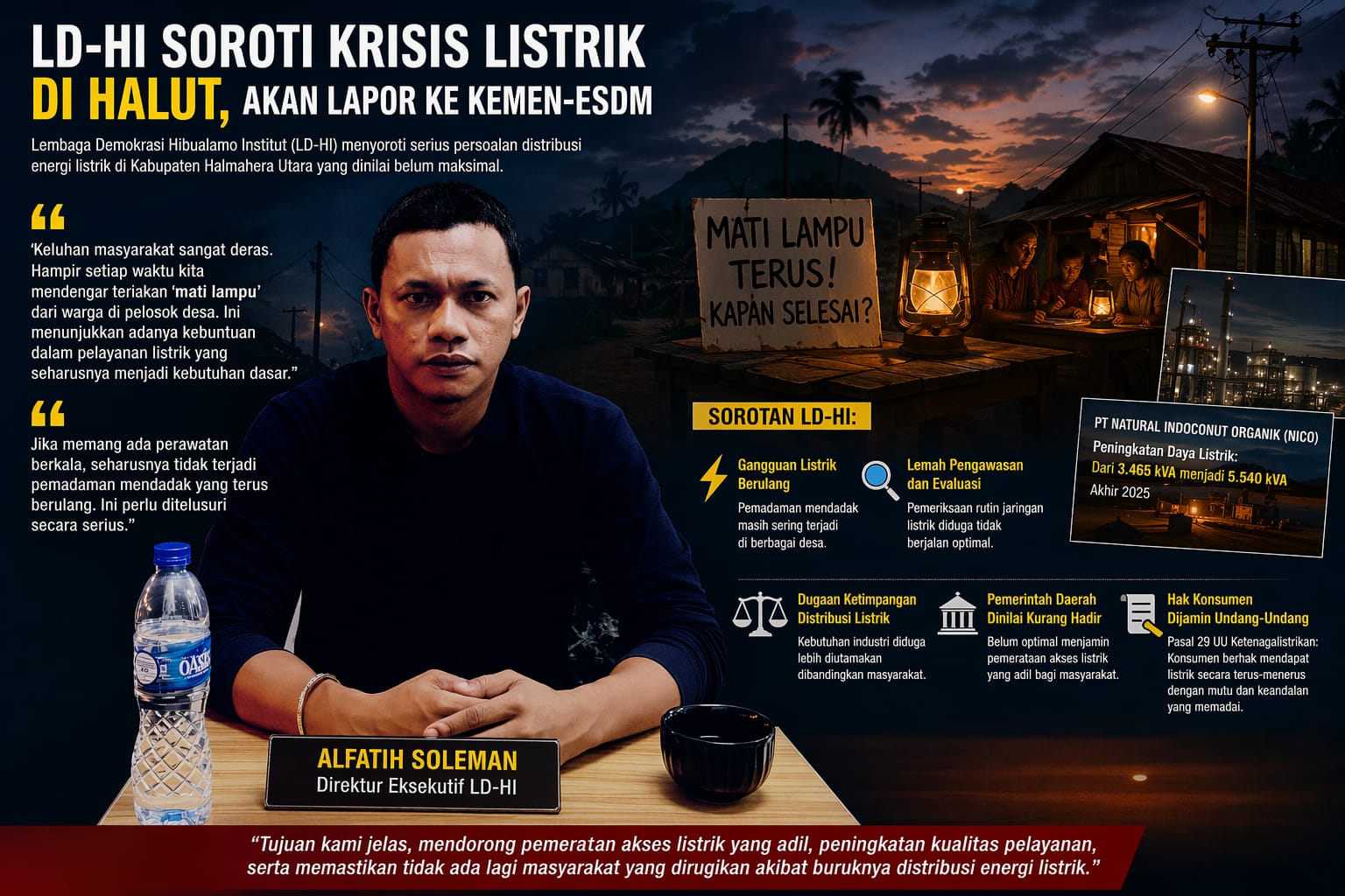 Direktur Eksekutif LD-HI, Alfatih Soleman, mengungkapkan bahwa berbagai desa di Halmahera Utara masih mengalami gangguan listrik yang berulang, mulai dari pemadaman mendadak hingga kualitas pasokan yang tidak stabil.